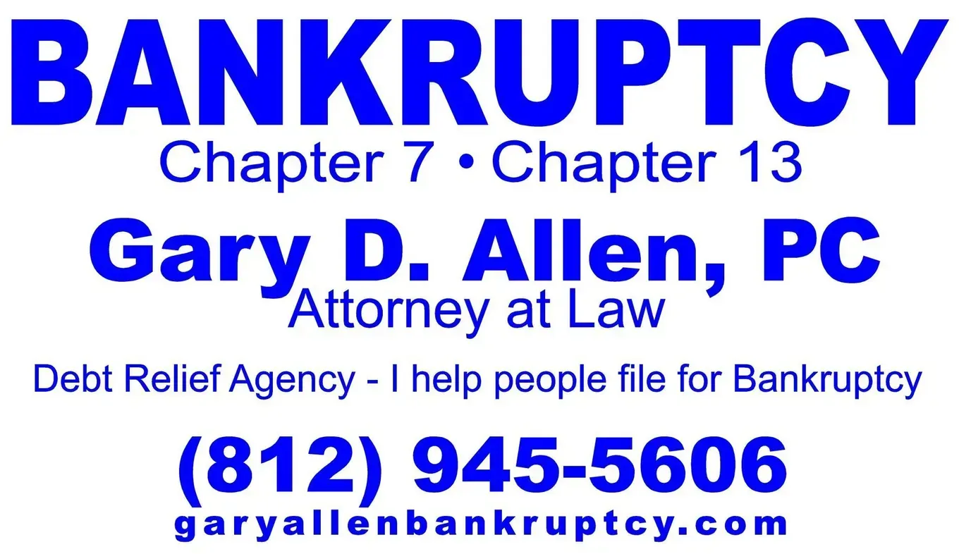 Gary D. Allen, Attorney files Chapter 7 and Chapter 13 bankruptcy cases in the United States Bankruptcy Court, Southern District of Indiana, New Albany Division, for Indiana residents of Clark, Crawford, Dearborn, Floyd, Harrison, Jackson, Jefferson, Jennings, Lawrence, Ohio, Orange, Ripley, Scott, Switzerland, and Washington counties. Residents of these Indiana counties file their bankruptcy cases in the United States Bankruptcy Court, Southern District of Indiana, New Albany Division. These counties include the towns of Clarksville, Jeffersonville, Borden, Charlestown, Milltown, English, Lawrenceburg, New Albany, Corydon, Seymour, Brownstown, Madison, North Vernon, Bedford, Paoli, Scottsburg, and Salem.